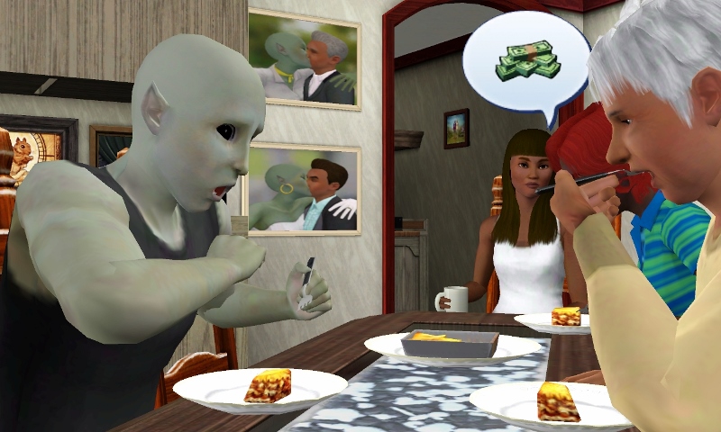 Pelissä mietin, että onpa Jutta söpö tuossa asussa. Nyt en ole enää ihan varma :D Mutta Andrew'n puhekuplasta näkyy, että nököhampaiden takana on ihan nätti sim!